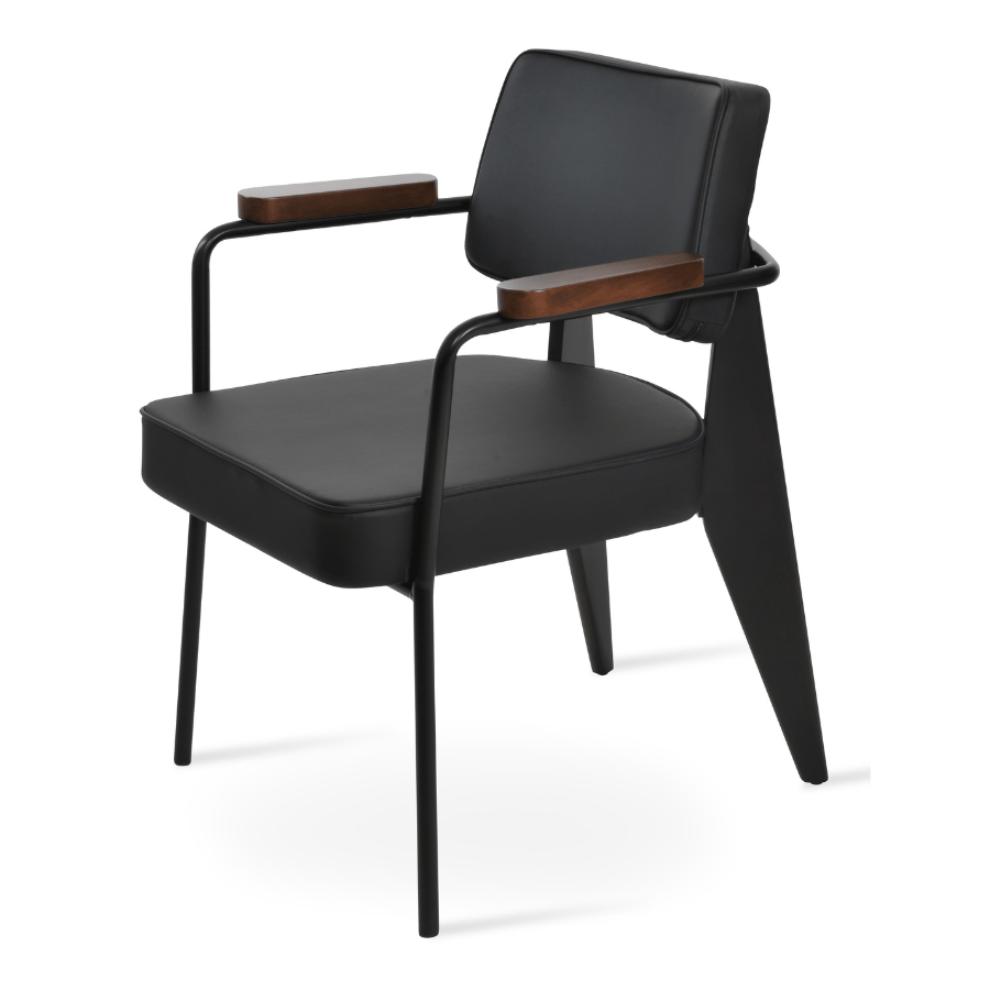 Black Metal Dining Chairs Prouve Armchair is a metal base and ppm faux leather seat metal dining chair for your dining room. Black Metal Dining Chairs Prouve Armchair is an industry style chair available with upholstered seat. The front legs are finished in black metal and back legs are solid ash finished in black. The armrests are solid beech in walnut finish. With faux leather upholstered seat and backrest and wonderful armrests Black Metal Dining Chairs Prouve Armchair will elevate all types of dining rooms. Prouve Armchair is a striking yet plain, practical, and modern dining chair with comfortable seat, armrest and backrest for ergonomic climax. Exclusively Designed by sohoConcept.